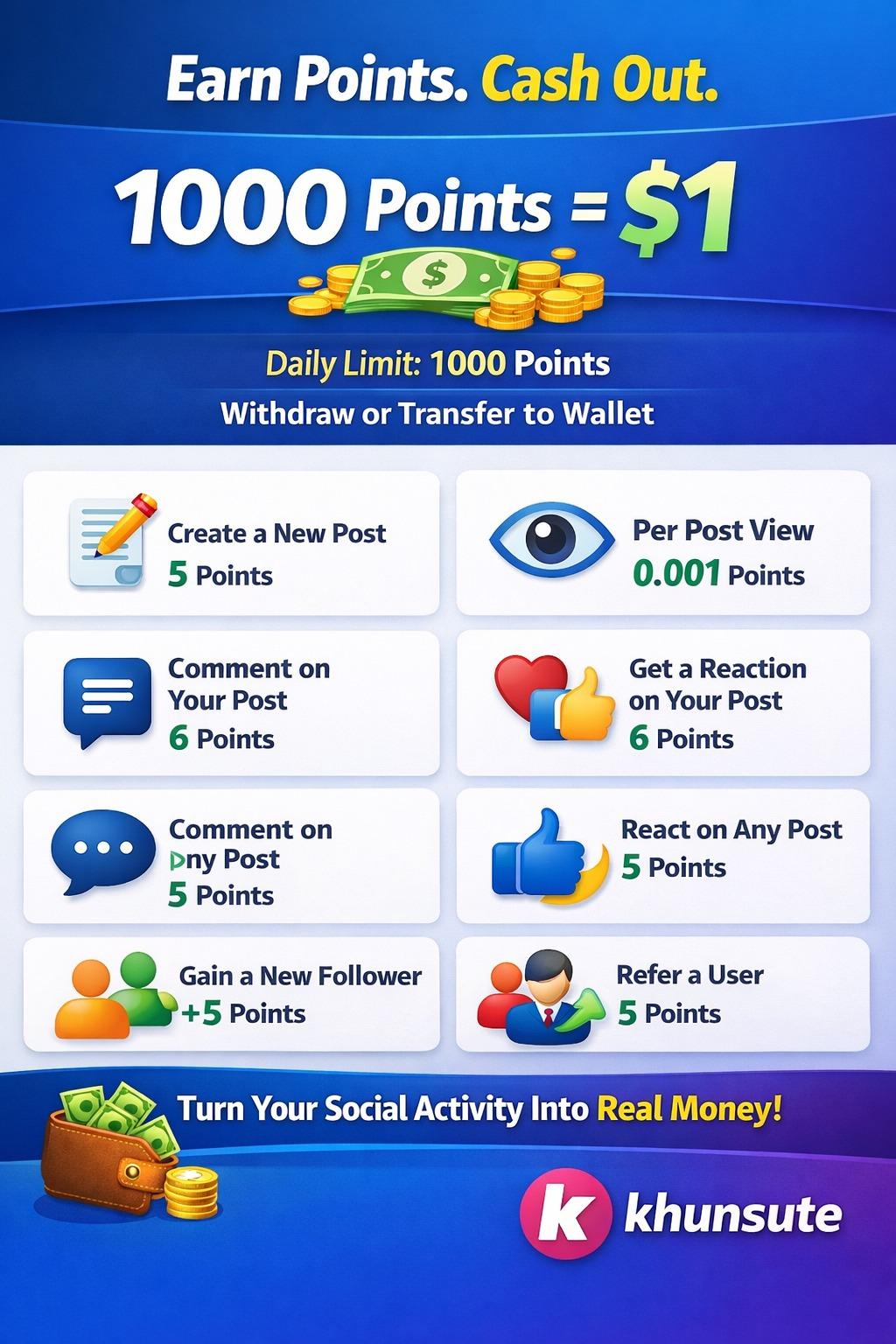 1000 points = $1 — withdraw or transfer to your wallet anytime.Join #khunsute Post, React, Earn. Earn points for every post, view, comment, reaction, follower, and referral. 1000 points = $1 — withdraw or transfer to your wallet anytime.0 Comments 0 Shares 0 ReviewsPlease log in to like, share and comment! -